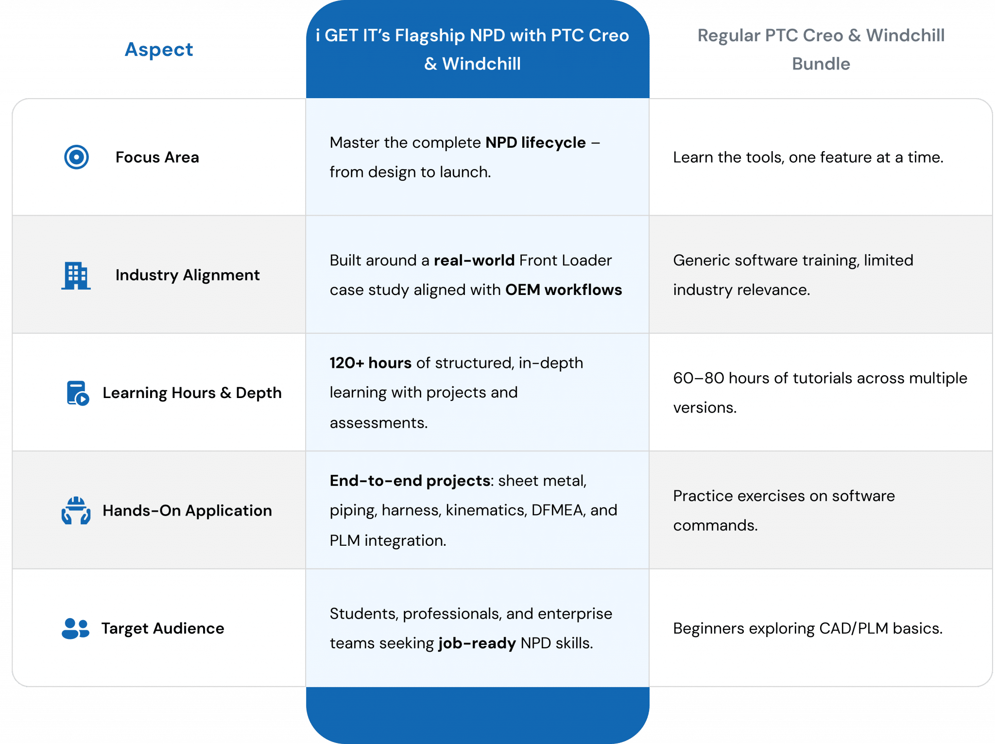 | Aspect | Regular PTC Creo & Windchill Bundle | i GET IT’s Flagship NPD with PTC Creo & Windchill |