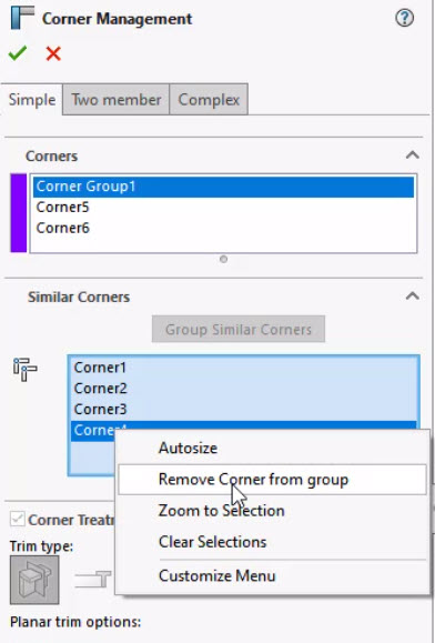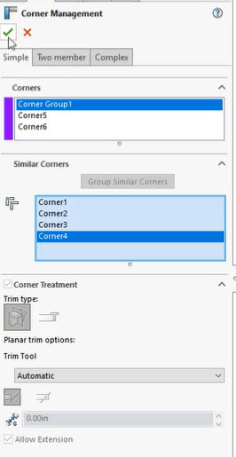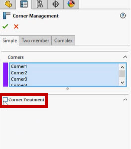 Click on Corner Management in the Feature Tree to edit the existing treatments. Click on Corner Treatment that Highlights a Simple, Two-member or Complex corner.
