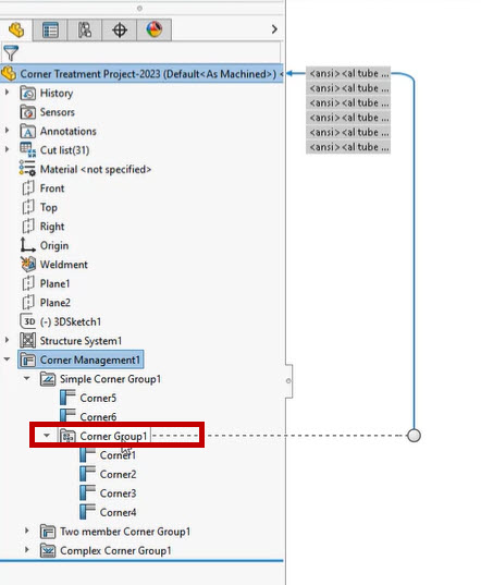 When we exit Corner Management, we can see that grouped corners are contained in specific folders within the Feature Manager.
