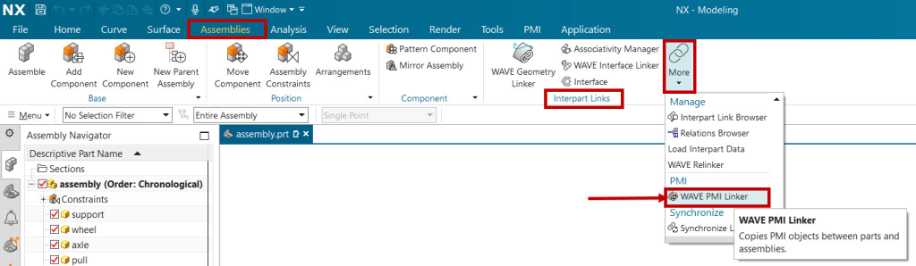 Go to Assemblies > Interpart Links > More > Wave PMI Linker