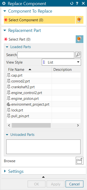 Select Assemblies tab > Component group > More > Component gallery > Replace Component to display the Replace Component dialog.