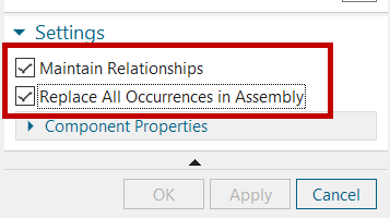 Expand the dialog and the Settings pane and verify both Maintain Relationships and Replace All Occurrences in Assembly are active.