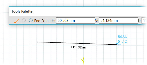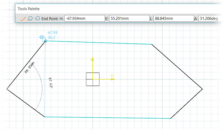 Within the Tools Palette of a CAD software, input the Horizontal (H) and Vertical (V) values for the initial point of your sketch. Upon pressing the TAB key, the text boxes dynamically update, allowing you to specify the endpoint coordinates.