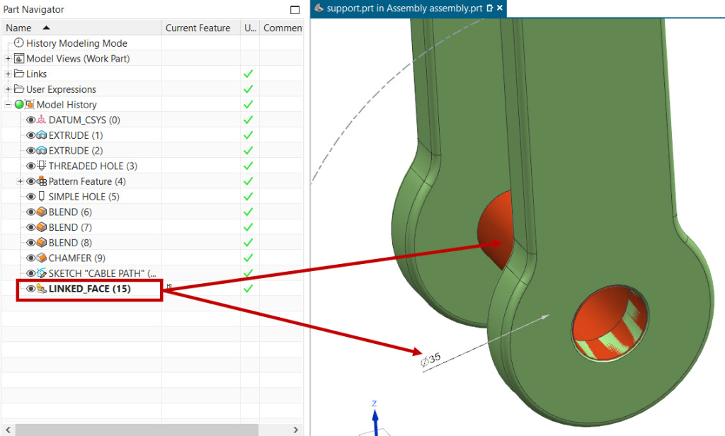 You can observe that one linked face of “axle” with PMI dimension “Φ35” which we have selected already are seen under part navigator tree structure as shown.